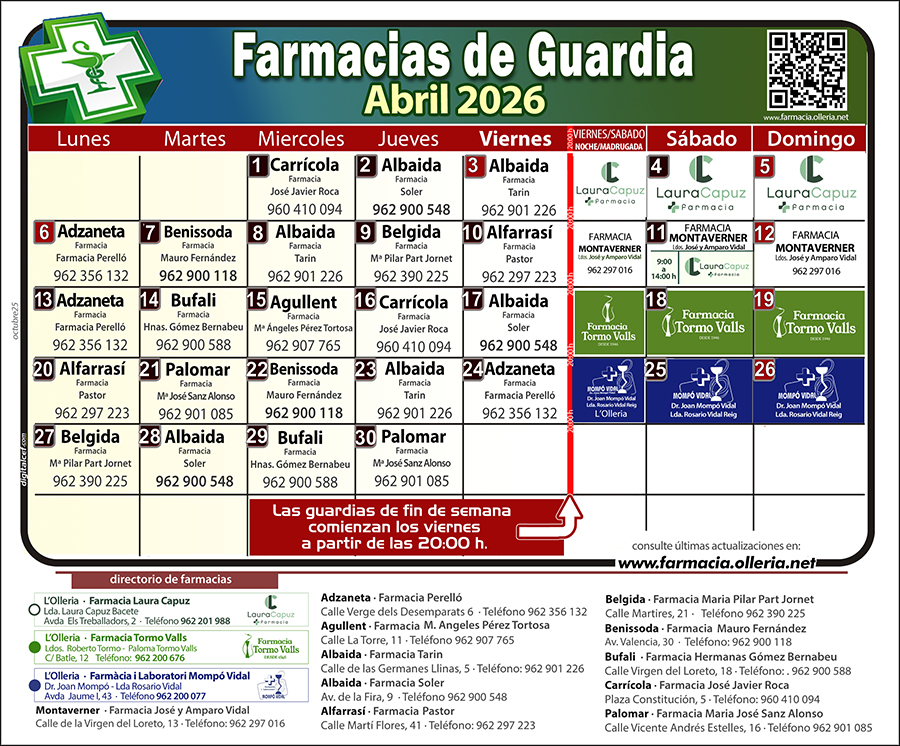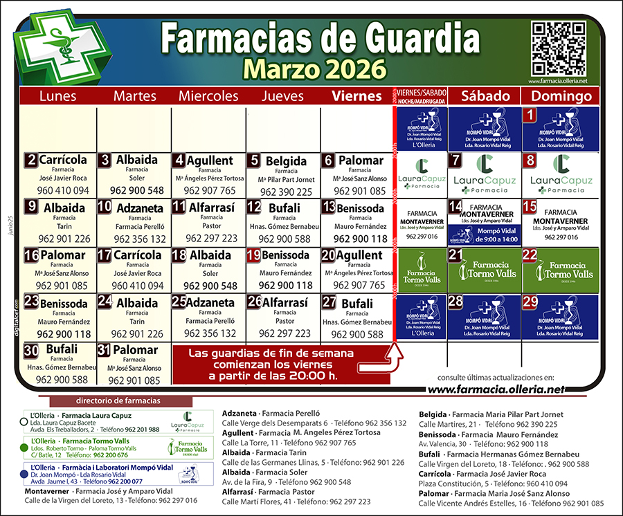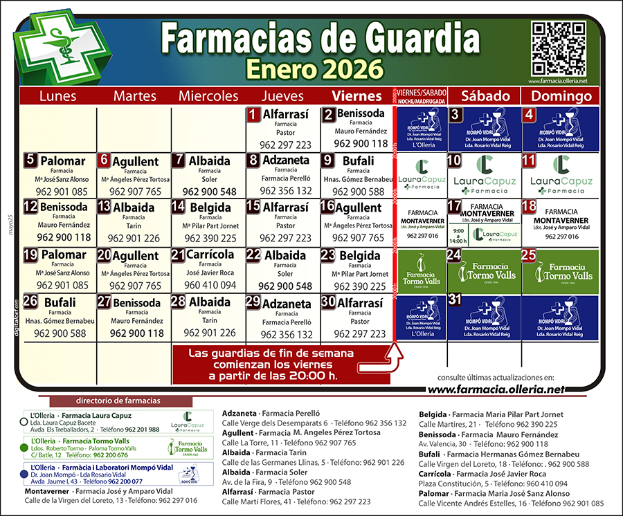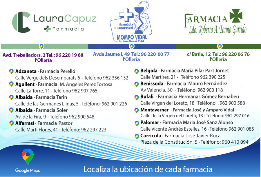 Farmacias de Guardia en l'Olleria y poblaciones próximas (Zona 23)